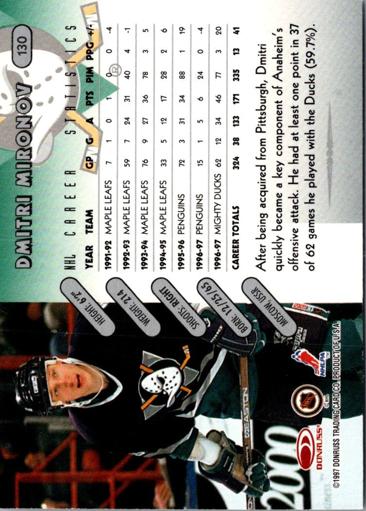 The 1997 Donruss Dmitri Mironov #130 Anaheim Mighty Ducks card is a great collectible item for any fan of the Anaheim Mighty Ducks. This card features a great color photo of Dmitri Mironov, who played for the Ducks in the 1990s. The card is printed on premium card stock and features a glossy finish. The back of the card includes his complete career stats and a short biography. Add this card to your collection today and show your support for the Mighty Ducks!