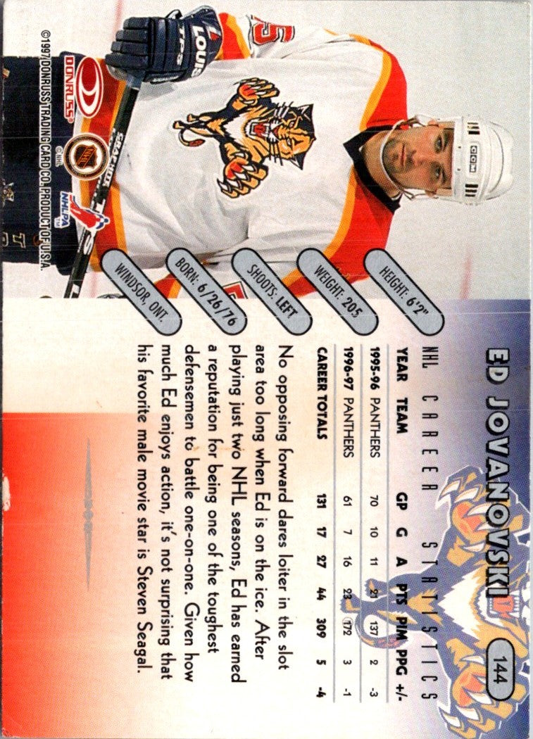 This 1997 Donruss Ed Jovanovski #144 card is a must-have for any hockey fan! Ed, a former Florida Panthers player, was an exceptional defenseman and a two-time All-Star. His 1997 card features an action shot of him carrying the puck with his signature stickhandling style. This card also features a special Donruss design on the back and a number of stats about Ed's career. Add this card to your collection today and show your Panthers pride!