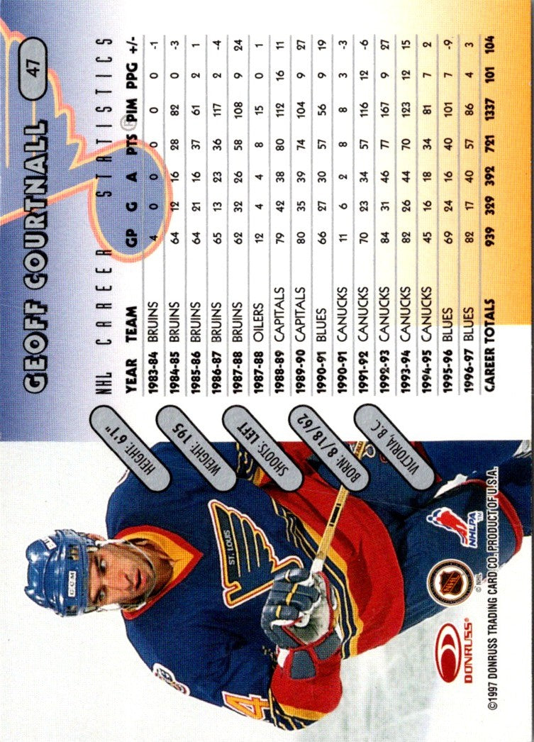 This 1997 Donruss Geoff Courtnall #47 St. Louis Blues card is a must-have for Blues fans and hockey card collectors alike. Featuring a stunning action shot of Courtnall in his St. Louis Blues jersey, it's a great way to commemorate one of the team's greatest players. This card is in excellent condition and would make a great addition to any hockey card collection.