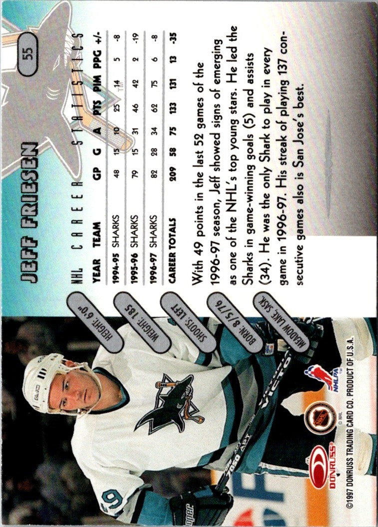 This 1997 Donruss Jeff Friesen #55 San Jose Sharks card is perfect for the hockey fan in your life! Jeff Friesen was a skilled forward and member of the San Jose Sharks, and this card captures a moment of the player in action. This card is a great way to show off your Sharks spirit and is a wonderful way to commemorate a fan favorite. Add this card to your collection today!