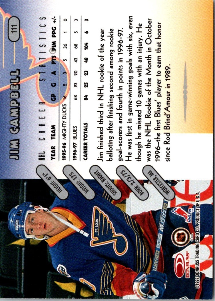 This 1997 Donruss Jim Campbell #111 St. Louis Blues card is the perfect addition to any hockey fan's collection. Featuring a full-color image of the legendary Blues player in his classic pose, this card captures the spirit and energy of the game. With a glossy finish and sharp details, this card will make a great addition to any collection. Donruss is known for its high-quality cards, and this one is no exception. Whether you're a die-hard fan or just starting your collection, this card is sure to be a great addition.