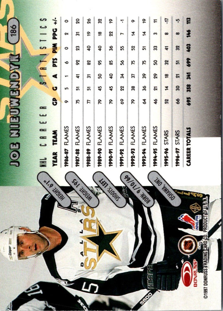 This 1997 Donruss Joe Nieuwendyk #186 card is a must-have for any collector or fan of the Dallas Stars. Showcasing a classic image of Joe in his Stars uniform, this card is a great addition to any collection. Its high-quality production and glossy finish will keep it looking good for years to come. A great piece of memorabilia to honor the accomplishments of one of the greatest Stars of all time. Get your hands on this card now and add a piece of hockey history to your collection!