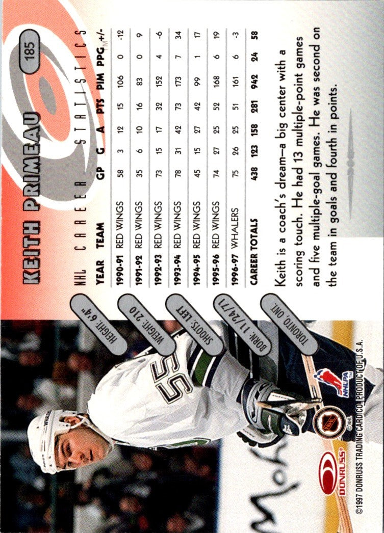 This 1997 Donruss Keith Primeau trading card is the perfect collectible for any Carolina Hurricanes fan! This card features a professional shot of Primeau ready to make the play. The card is in near mint condition, making it a great item to add to your collection. With this card, you can remember Primeau's impressive career with the Carolina Hurricanes.