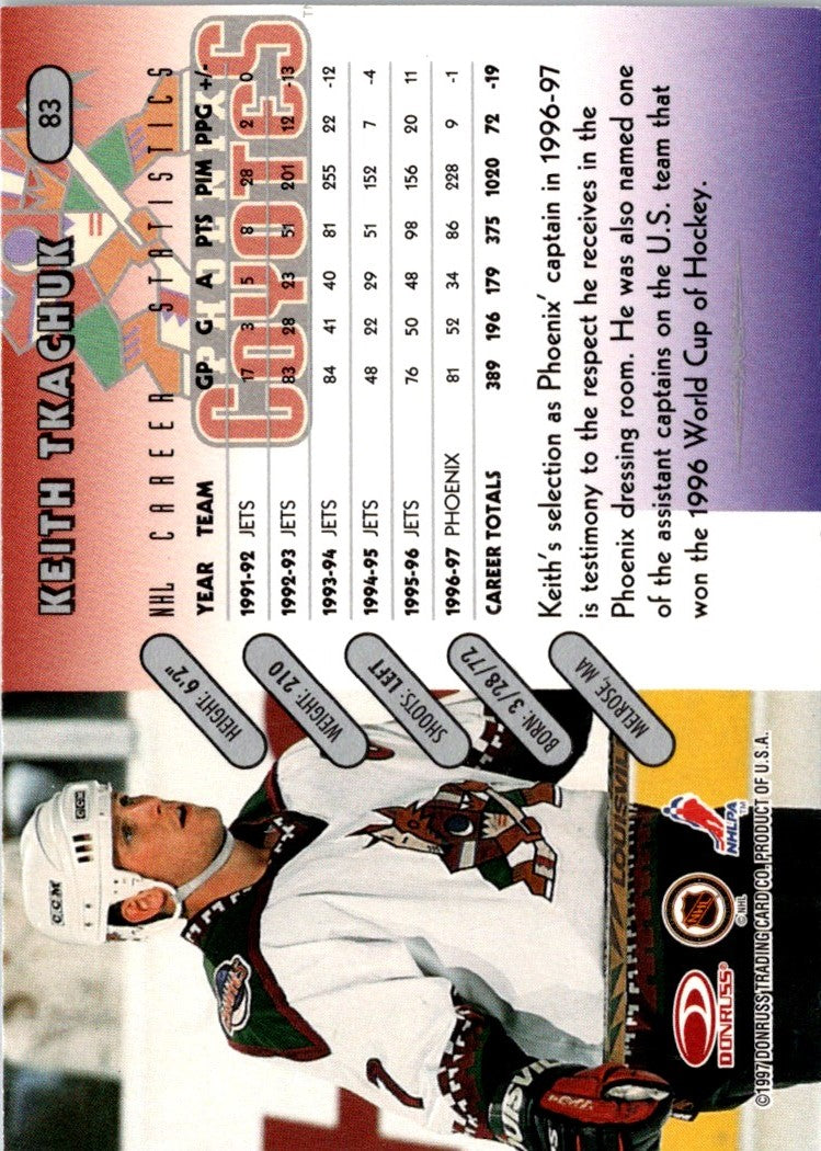 This 1997 Donruss Keith Tkachuk #83 Phoenix Coyotes card is a must-have for any hockey card collector. Featuring a realistic portrait of a young Tkachuk in his Coyotes uniform, this card is sure to bring back memories of his time in Phoenix. Tkachuk was a key contributor to the Coyotes' success in the late 1990s, and this card is a great way to commemorate his time with the team. Whether you're a fan of Tkachuk himself or just a fan of the Coyotes, this card is sure to be a valuable addition to your collection. Add it to your collection today!