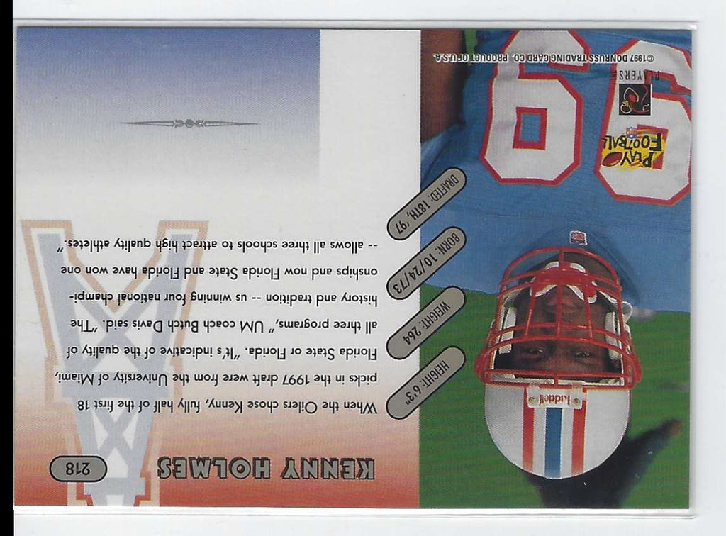 This 1997 Donruss Kenny Holmes #218 Tennessee Oilers card is a great addition to any football fan's collection! The card features a full-color image of Holmes in action, with a blue, white, and red border. The back of the card includes a brief biography of Holmes and his stats from the 1996 season. It is a must-have piece for any football card collector or Oilers fan! Get your hands on this classic card and add it to your collection today!