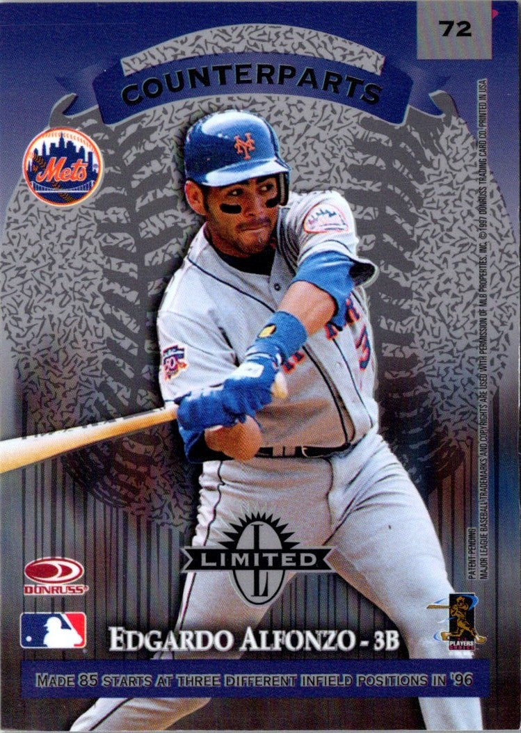 This 1997 Donruss Limited card #72 features Scott Rolen and Edgardo Alfonzo from the Philadelphia Phillies and New York Mets, respectively. It has a full-color photo of both players on the front with a blue background and the players' names and teams at the bottom. The card back has a brief bio of each player, with stats and highlights from their respective careers. This card is a great collectible item for any fan of MLB, especially those who root for the Phillies or Mets. Get yours today!