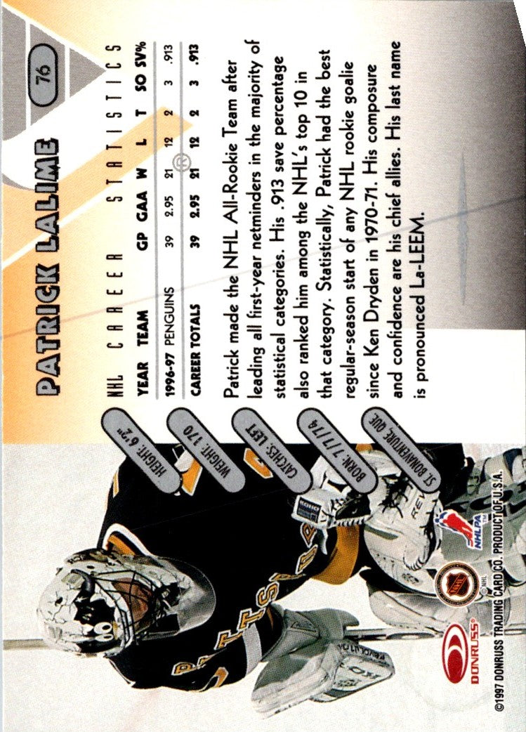 This 1997 Donruss Patrick Lalime #76 Pittsburgh Penguins card is a great addition to any collection. With a unique design and vibrant colors, this card is ideal for displaying or trading. Featuring an image of Lalime in a classic Penguins uniform and an action shot, this card captures his amazing skills. Whether you’re a fan of the Penguins or Lalime, this card is sure to impress. Add this 1997 Donruss Patrick Lalime #76 Pittsburgh Penguins card to your collection today!