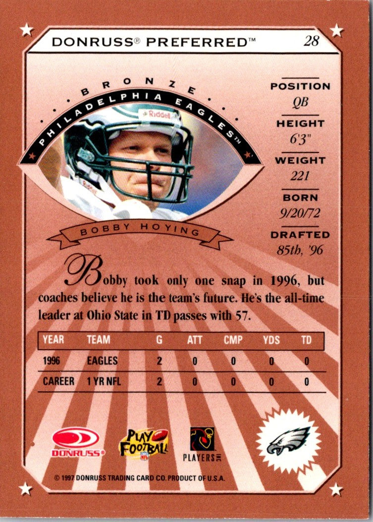 This 1997 Donruss Preferred #28 Bobby Hoying card is a must-have for any die-hard Philadelphia Eagles fan! Bobby Hoying was a huge part of the Eagles' success in the 1990s, leading them to the playoffs in 1996 and 1997. This card captures a unique moment in Eagles history, and is sure to be a great addition to any collection. Featuring vibrant colors and crisp details, this card is sure to stand out and make a statement in any collection. Get your hands on this piece of Eagles history before it's gone!