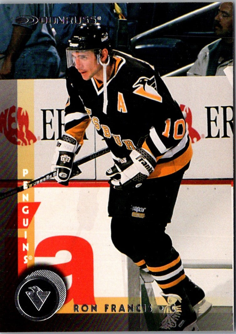 This 1997 Donruss Ron Francis #137 Pittsburgh Penguins trading card features a great action shot of the Hockey Hall of Famer in his Penguins uniform. This card is a must-have for any fan of the Penguins, or for any fan of Ron Francis. Show off your team pride and add this card to your collection today!