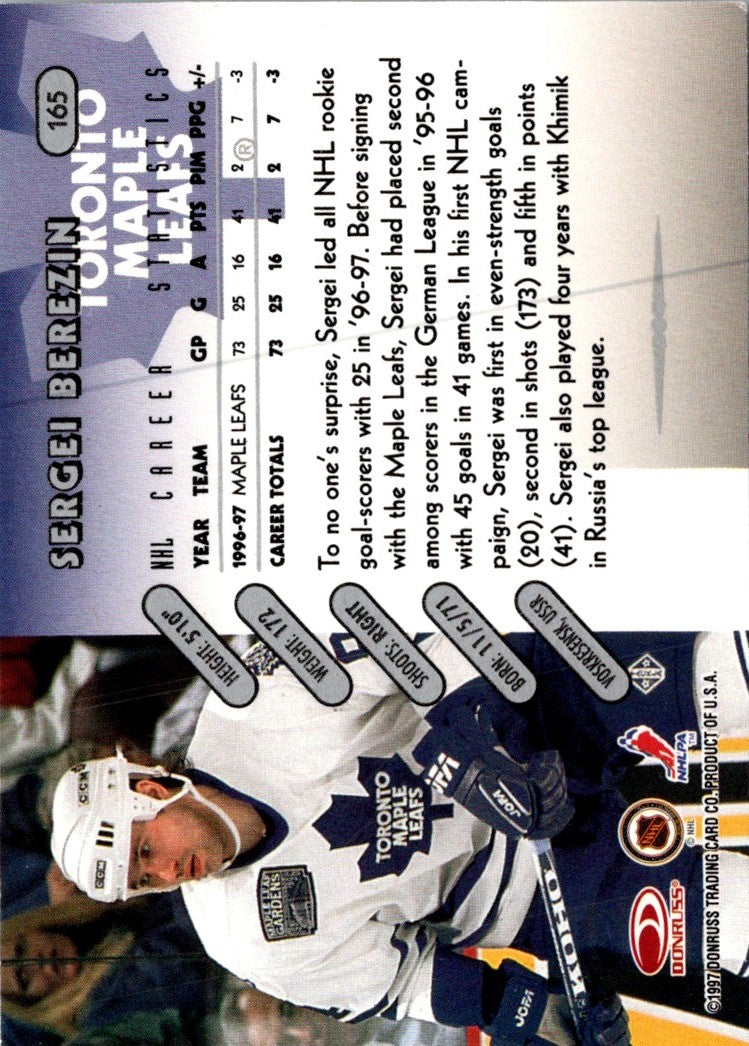 This 1997 Donruss Sergei Berezin #165 Toronto Maple Leafs card is a great addition to any Maple Leafs fan's collection. Featuring a vibrant design with an action shot of Sergei Berezin in his Maple Leafs uniform, this card is sure to be a hit with any collector. The card is in great condition and is a must-have for any fan of the Toronto Maple Leafs. Add this card to your collection today and show your team pride.