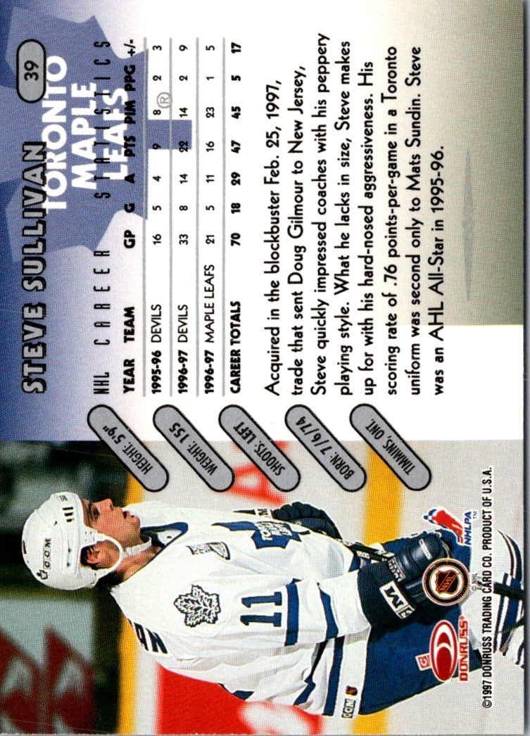 This 1997 Donruss Steve Sullivan #39 Toronto Maple Leafs card is a must-have for any Toronto Maple Leafs fan! Featuring a classic image of Sullivan in his Maple Leafs jersey and on a glossy card stock, this card is a great addition to any hockey card collection. With a card back featuring a detailed biography and career stats, this card is sure to be a hit with any hockey fan. Get your hands on this 1997 Donruss Steve Sullivan #39 Toronto Maple Leafs card and add it to your collection today!