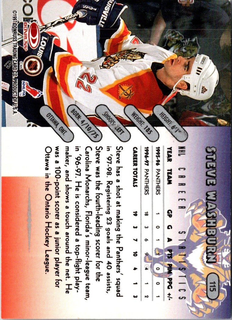 This 1997 Donruss Steve Washburn #115 Florida Panthers card is a must-have for any Panthers enthusiast! This card features a full-color photo of Washburn in his Panthers jersey, along with his stats and career highlights. It's an excellent way to show your support for the Panthers and add to your hockey card collection. Donruss cards are known for their quality and durability, so you can count on this card to stay looking great for years to come. Pick up your copy today!