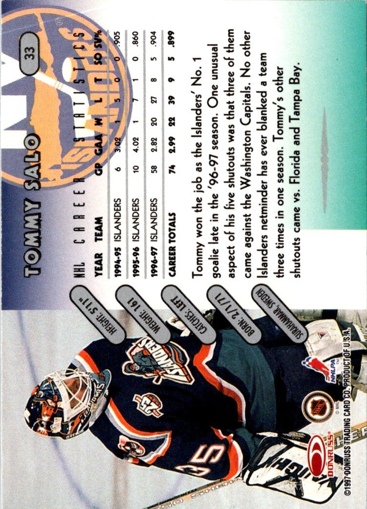 This 1997 Donruss Tommy Salo #33 New York Islanders card is a great addition to any hockey fan's collection! This card features a full-color action shot of Salo in his Islanders uniform, as well as his full name, team name, and position printed on the front. The back of the card includes Salo's career stats, as well as a detailed biography. This card is a perfect way to honor a great player and a great team!