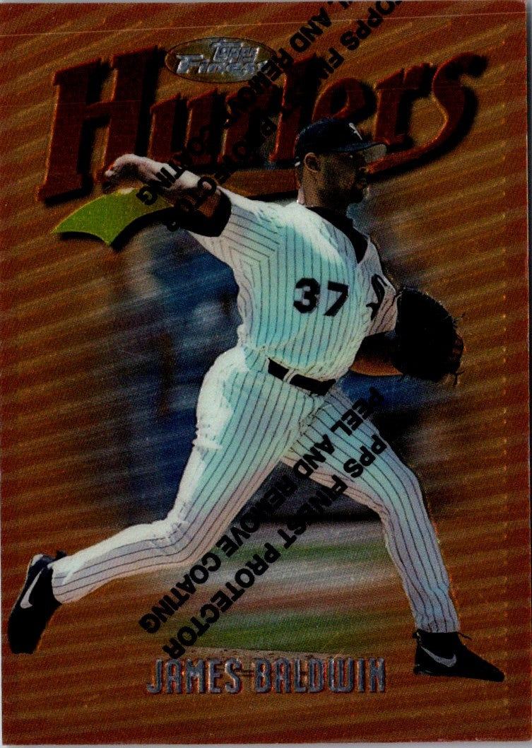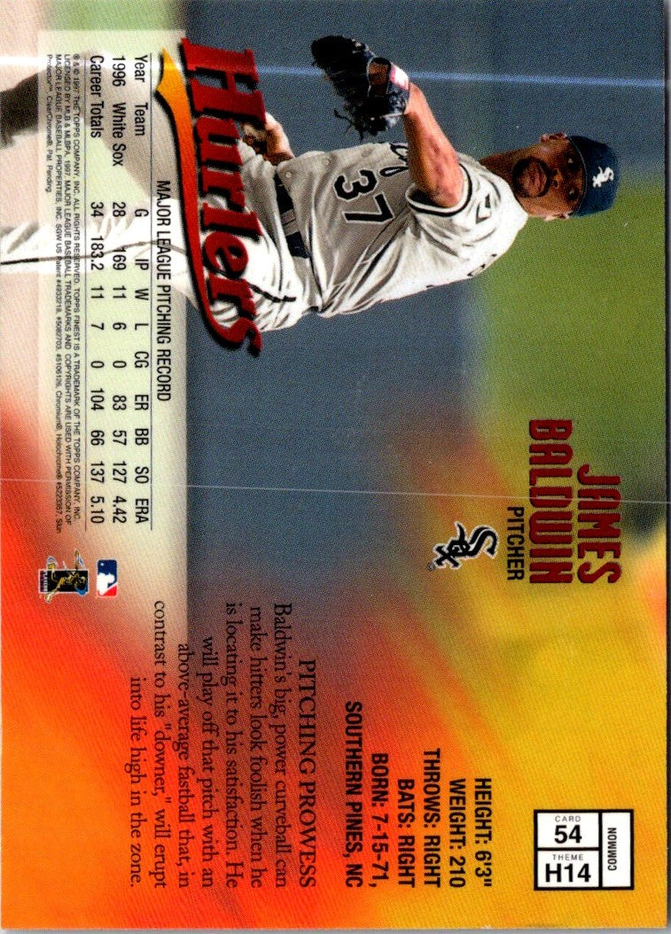The 1997 Finest James Baldwin #54 Chicago White Sox card is a must-have for any White Sox fan. Featuring an iconic image of Baldwin in his uniform, this card is sure to be appreciated by any collector. With its vibrant colors and detailed graphics, this card is sure to make a great addition to any collection. The card is also in excellent condition, making it a great item to add to your sports memorabilia collection. Add this classic card to your collection today!