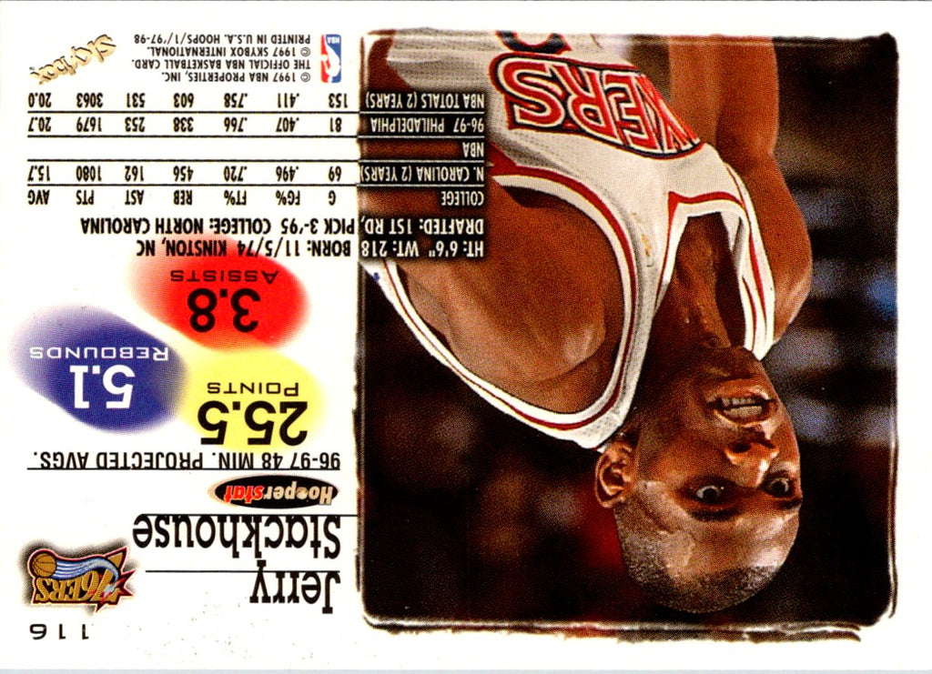 This 1997 Hoops Jerry Stackhouse card is a must-have for any Philadelphia 76ers fan! It features a vibrant, full-color image of the up-and-coming NBA star in his 76ers uniform, with the team's logo prominently displayed in the background. It is a great way to show your support of the team and to collect a piece of basketball history. Get yours today and start building your collection!