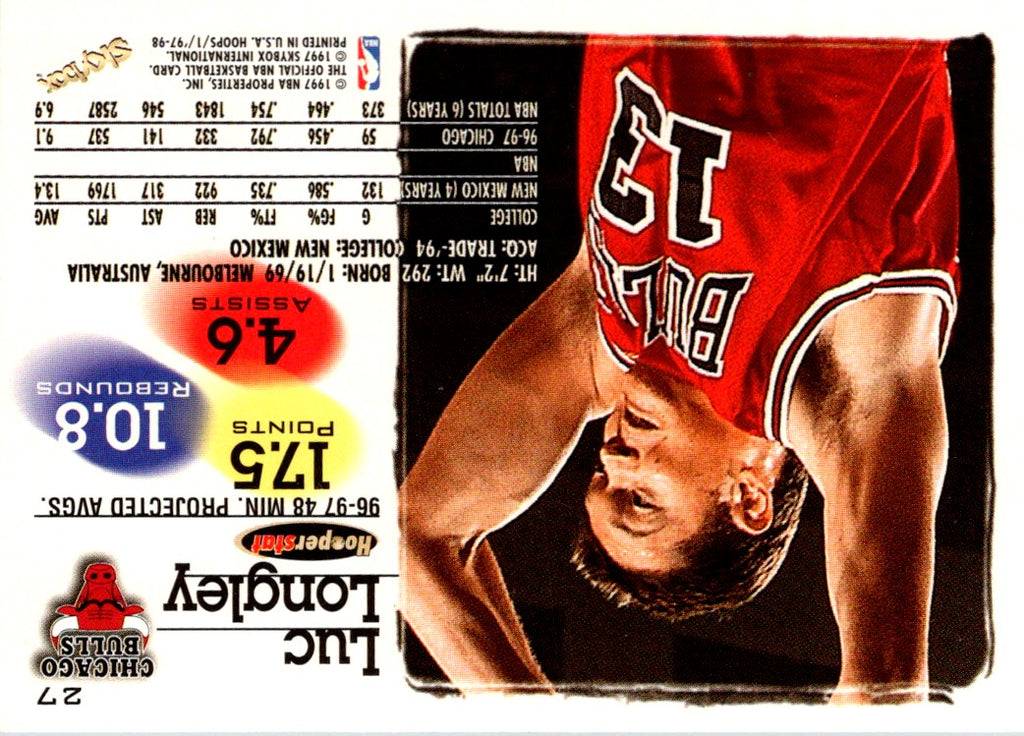Introducing the 1997 Hoops Luc Longley #27Chicago Bulls commemorative card! This card celebrates the legacy of one of the greatest Chicago Bulls players in team history. Featuring a high-quality glossy finish, it is the perfect way to show your admiration for Luc Longley's incredible career. This collectible card captures the Chicago Bulls' iconic colors and logo, and is sure to be a treasured piece of memorabilia for years to come. Add it to your collection today and show your support for the Bulls!