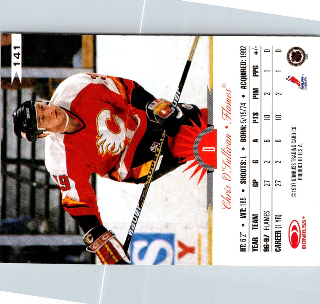 This 1997 Leaf Chris O'Sullivan #141 Calgary Flames card is a must-have for any Flames fan. Show your support for the team by collecting this card of one of the most popular players in team history. The card features O'Sullivan in his Flames uniform, with a detailed image of the real-life player. This card is a great way to show your devotion to the Flames as well as your admiration for Chris O'Sullivan.