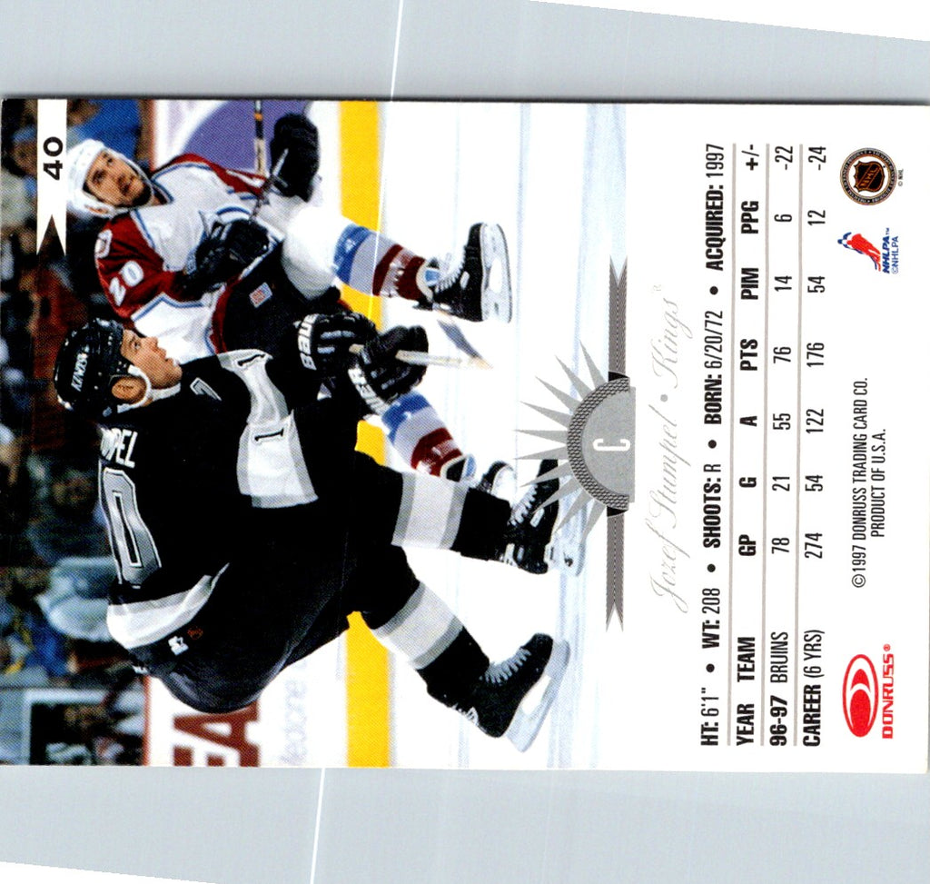 This 1997 Leaf Jozef Stumpel #40 Los Angeles Kings card is a great addition to any hockey fan's collection. Featuring a bold image of the Slovakian forward in his Los Angeles uniform, this card captures the energy and excitement of the era. The card is printed on high quality card stock and features the official team logo on the back. This card is sure to be a hit with any Kings fan or hockey card collector. Make sure to add it to your collection today!