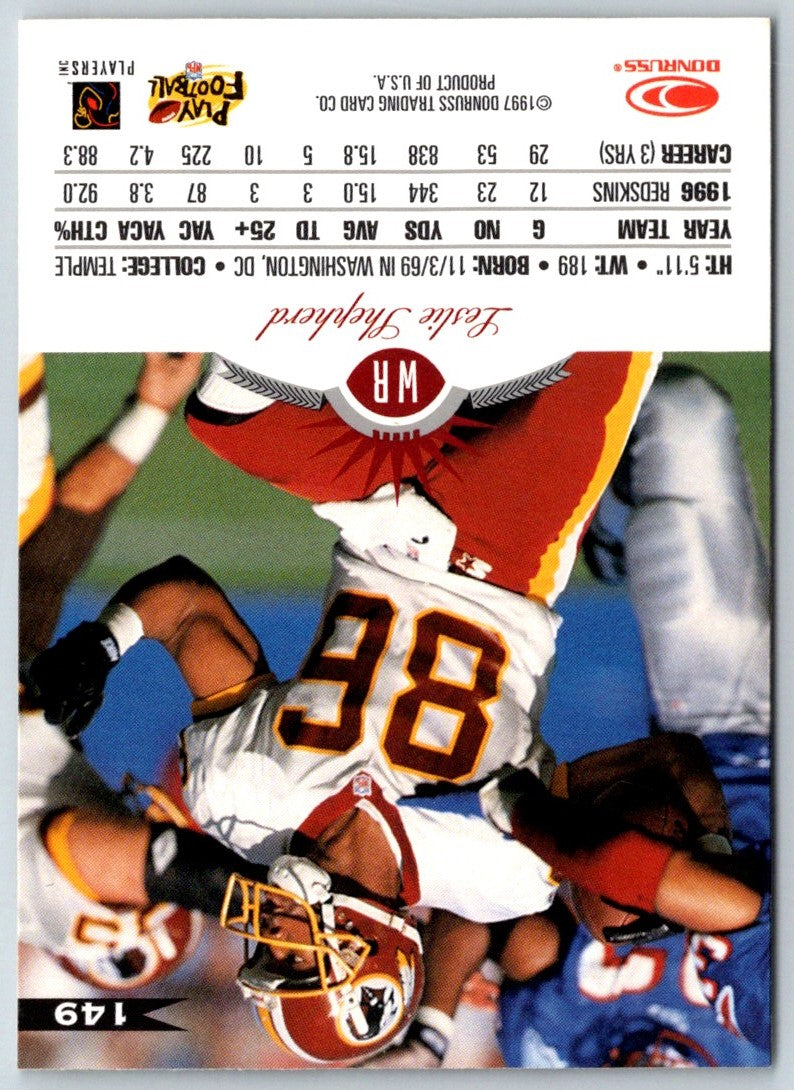 This 1997 Leaf Leslie Shepherd #149 Washington Redskins card is a must-have for any Redskins fan! This card features a high-gloss finish and a full-color action photo of Shepherd on the field. It also includes a detailed description of Shepherd's NFL career, along with his vital stats. A great addition to any football card collection, this card is sure to become a favorite!