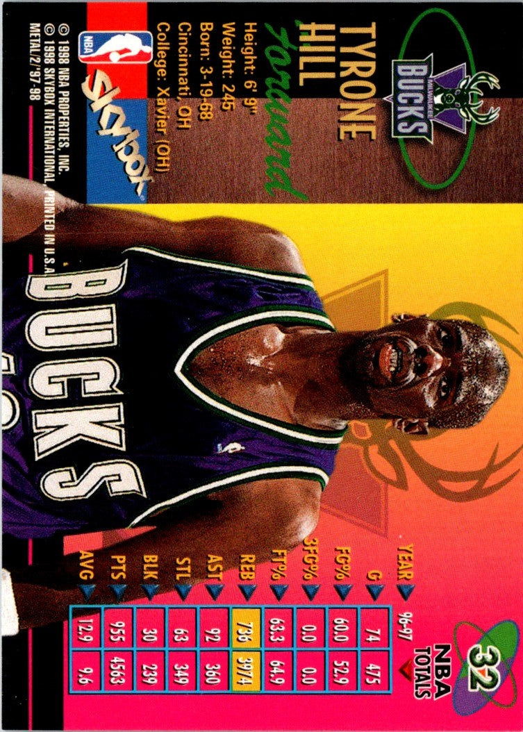 Tyrone Hill was a highly respected power forward in the NBA in the 1990s, and his 1997 Metal Universe card is a must-have for any basketball fan. This card celebrates his time with the Milwaukee Bucks with its color photo of Hill in action. The card is encased in a protective coating to keep it looking mint condition, and its place in the Metal Universe set makes it a great addition to any basketball card collection.