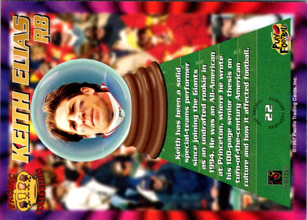 The 1997 Pacific Dynagon Prism Best Kept Secrets Keith Elias #22 New York Giants card features an action shot of the star running back in a Giants uniform. The card has been printed on thick card stock and features a glossy finish. The card includes a full-color photo of Elias and a summary of his stats for the 1997 season. This card is a must-have for any fan of the New York Giants or Elias himself. The card will be a great addition to any collection and is sure to be a conversation starter. Don't miss your chance to add this card to your collection today!