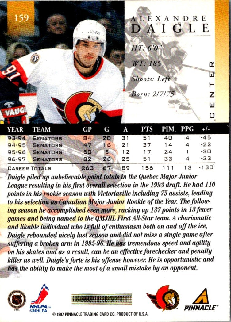 This 1997 Pinnacle Alexandre Daigle #159 Ottawa Senators card is a must-have for any hockey fan! Daigle was a former first overall pick of the Senators in 1993 and went on to star in the NHL for 12 seasons. This card is in near mint condition and features a great action photo of Daigle in his Senators uniform. A great piece to add to any collection, don't miss out on this chance to own a piece of hockey history!