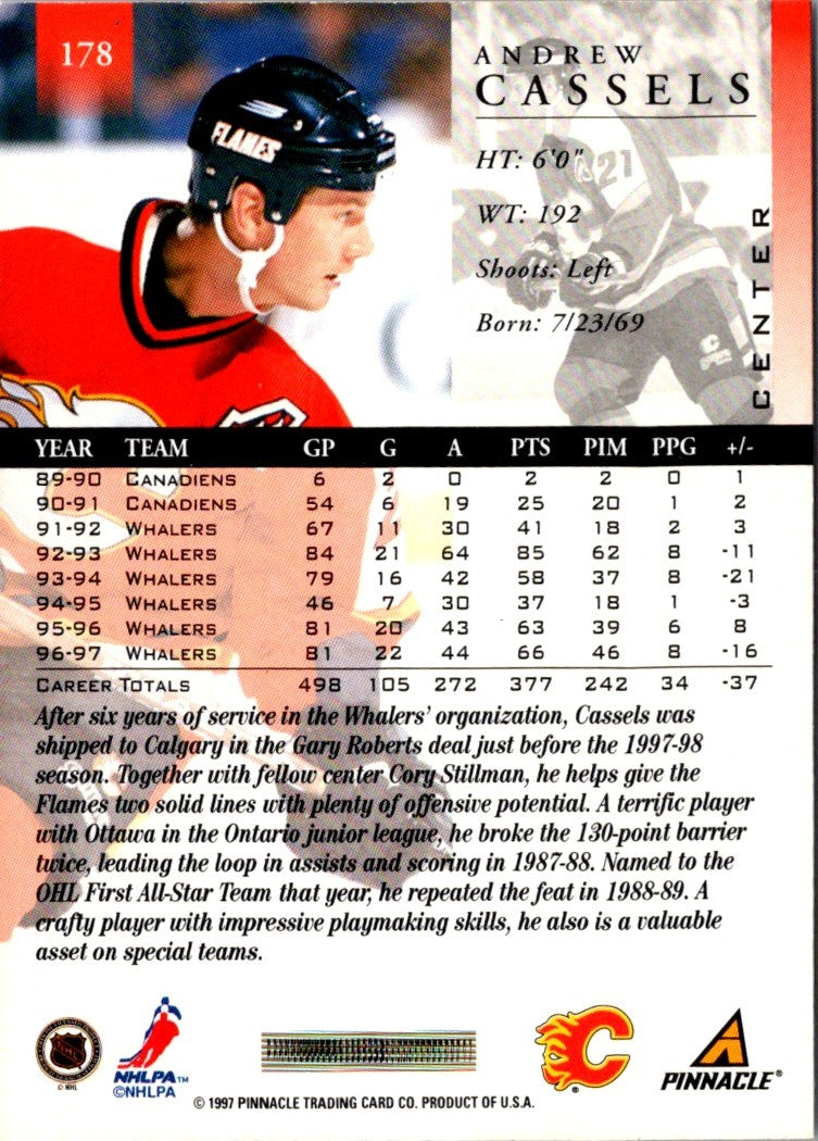 This 1997 Pinnacle Andrew Cassels #178 Calgary Flames card is a great addition to any hockey fan's collection! It features a sharp image of Cassels in his iconic Flames jersey, as well as detailed stats from that season. It's an essential piece for any fan of this storied franchise! Add this classic card to your collection today!