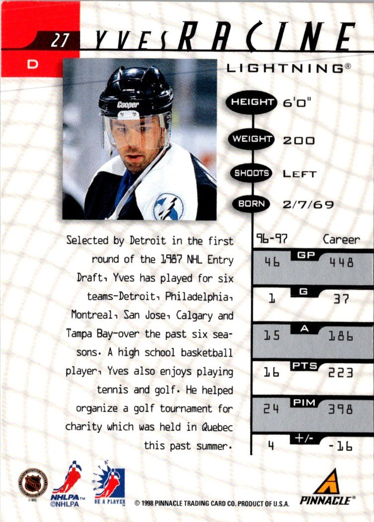 This 1997 Pinnacle Be a Player Yves Racine #27 Tampa Bay Lightning card is a must have for hockey fans. Featuring a great action shot of Yves Racine on the ice, this card will look perfect in any collection. Representing one of the most successful teams of the 90's, this card is a great way to show your support for the Lightning. Don't miss your chance to own this piece of hockey memorabilia!