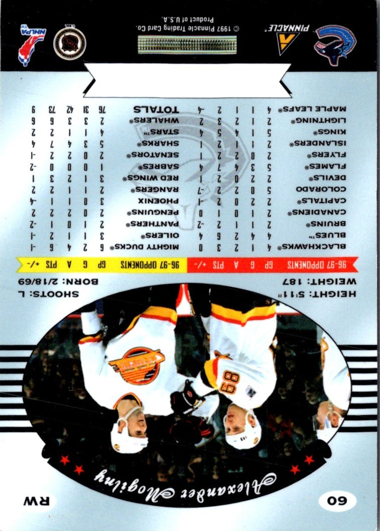 This 1997 Pinnacle Certified Alexander Mogilny #60 Vancouver Canucks card is a must-have for any serious collector. Showcasing a bold design, this card features Mogilny in his signature blue and green Vancouver Canucks jersey. The card also includes a detailed action shot of Mogilny in full stride, along with his career stats from the 1996-97 season. Get your hands on this card and add it to your collection today.