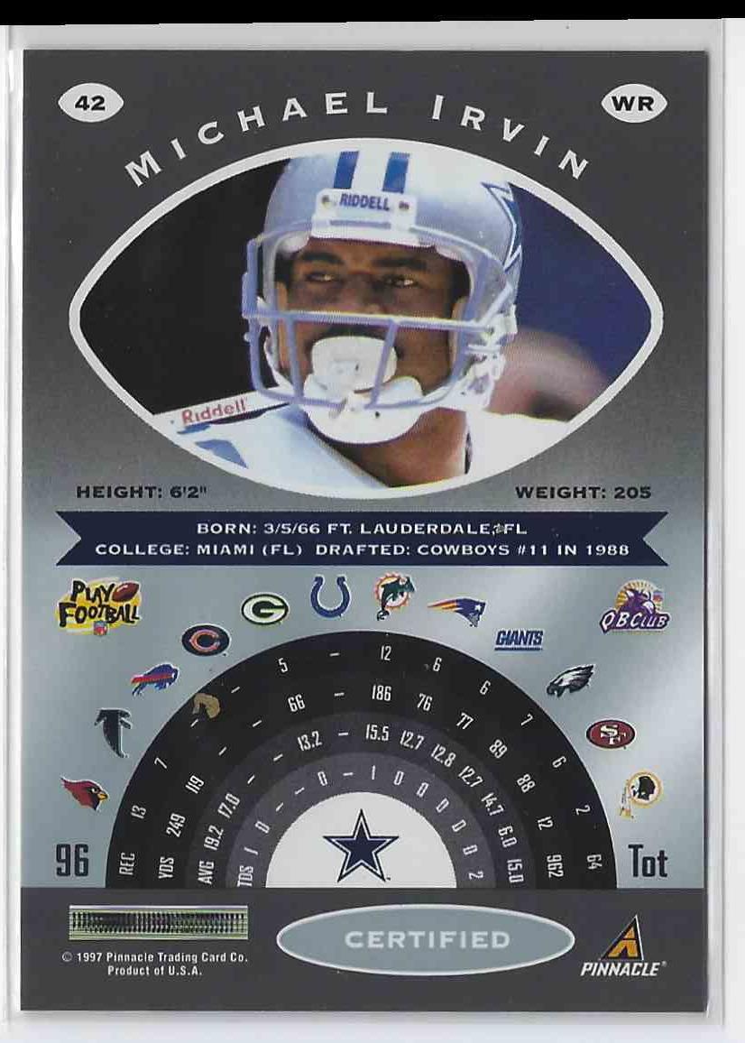 The 1997 Pinnacle Certified Michael Irvin #42 is the perfect item for any sports memorabilia collector or Dallas Cowboys fan. This card features a unique design that includes a photo of Irvin in action and his signature Cowboys jersey. The back of the card is filled with stats and accomplishments, providing a look into the Hall of Famer's storied career. The glossy finish gives the card a professional look and feel that is sure to be the centerpiece of any card collection. Show your support for one of the best Cowboys of all time with the 1997 Pinnacle Certified Michael Irvin #42!