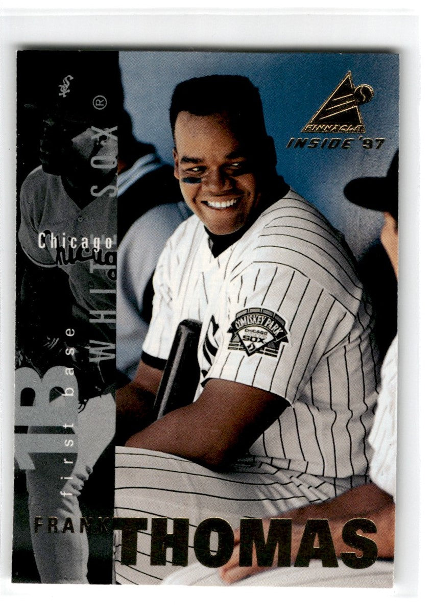 This 1997 Pinnacle Inside Frank Thomas #13 Chicago White Sox card is a must-have for any White Sox fan! This card features a full-color photo of Frank Thomas in his White Sox uniform and is in excellent condition. The card also includes a special foil stamp of Frank Thomas' facsimile signature and an embossed hologram of the Chicago White Sox logo. This card is sure to be a great addition to any collection and will be a great conversation piece for years to come.