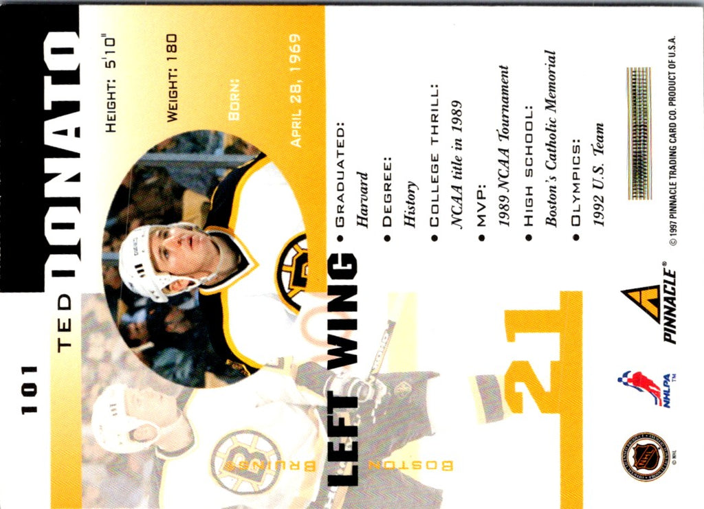 This 1997 Pinnacle Inside Ted Donato #101 is a must-have for any Boston Bruins fan! The card features a great action shot of Donato in his Bruins jersey, with vibrant colors and crisp details. The card back lists Donato's career statistics and highlights, making it a great collectible to remember his time in Boston. Donato was an important part of the Bruins organization for many years, and this card is a great way to commemorate his time with the team. Add this card to your collection today and celebrate the legacy of Ted Donato!