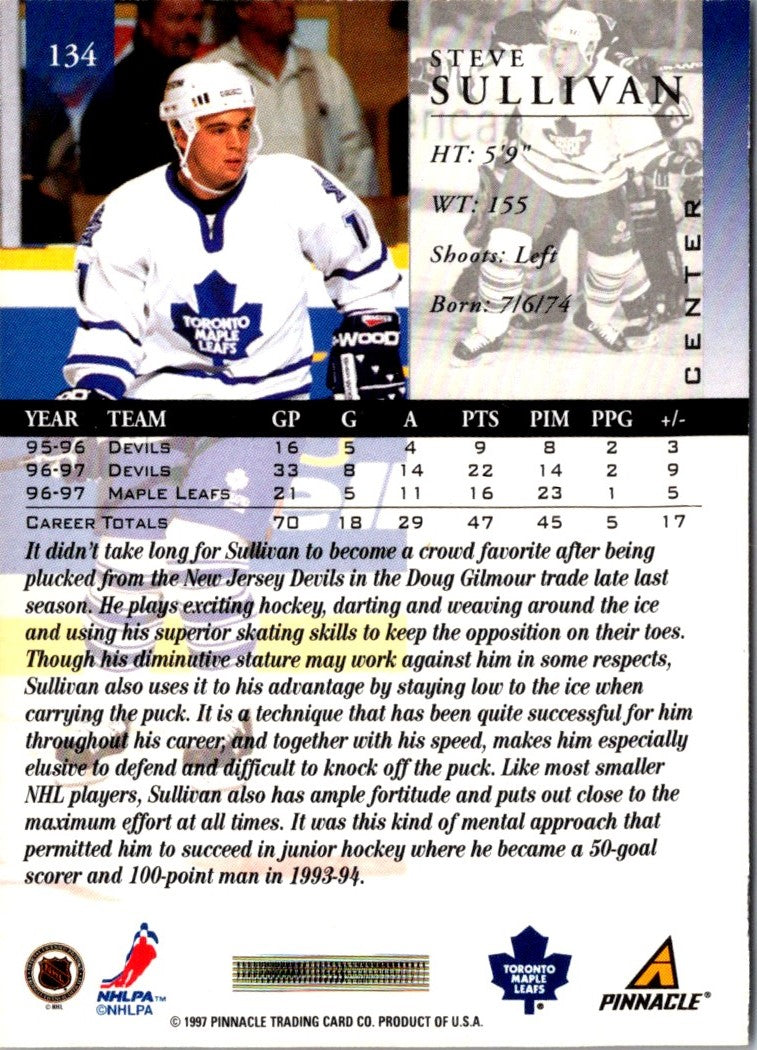This 1997 Pinnacle Steve Sullivan #134 Toronto Maple Leafs card is a must-have for any hockey fan's collection. Featuring the professional player in full Maple Leafs uniform, this card is sure to be a timeless classic. With its detailed design, vibrant colors, and high-quality finish, this card is sure to stand the test of time. Perfect for collectors or as a memorable gift, add this card to your collection today.