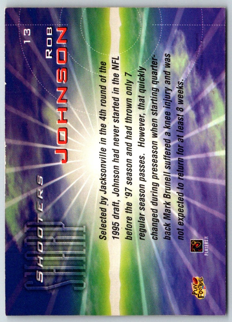 This 1997 Playoff Zone Sharpshooters Rob Johnson #13 Jacksonville Jaguars card is a must-have for any serious collector. Featuring a bright, full-color image of the star quarterback, this card is sure to look great in any collection. It also features a detailed description of Johnson's stats and accomplishments. Show your support for the Jaguars and add this card to your collection today!