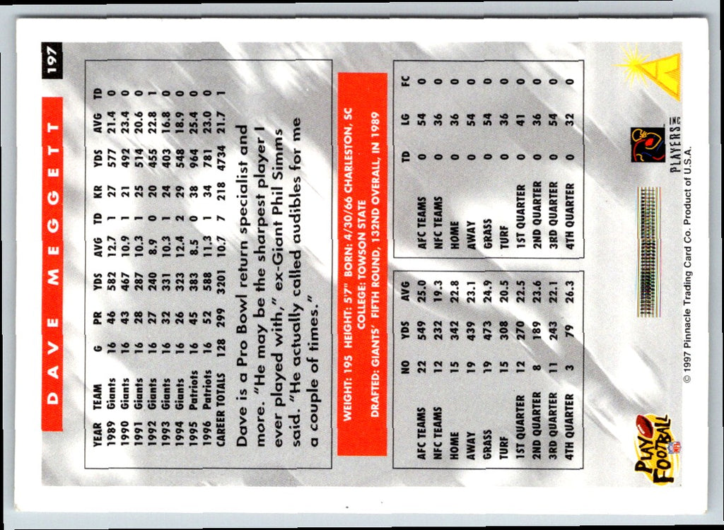 This 1997 Score Dave Meggett #197 card is the perfect way to commemorate the career of the New England Patriots running back. Meggett's career was marked by great success, both with the Patriots and the New York Giants. This card captures the essence of an unforgettable player, with a sharp image of him in action and a brief biography on the back. You can own a piece of football history with this card, and show your support of one of the NFL's greatest players.
