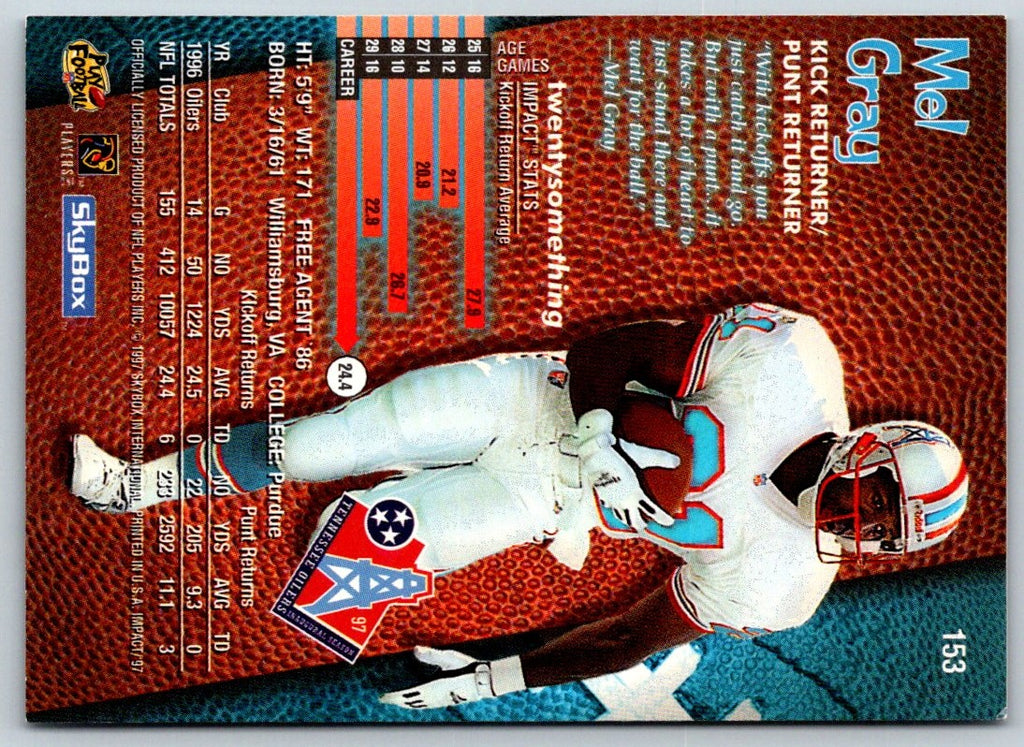 This 1997 SkyBox Impact Mel Gray #153 Tennessee Oilers card is a must-have for any die-hard fan. Featuring a sharp image of Gray, it captures the intensity of the game in a single moment. The card is printed on high quality glossy stock and is sure to make a great addition to any collection. It's the perfect piece of memorabilia for any Oilers fan who wants to commemorate one of the greatest players in team history.