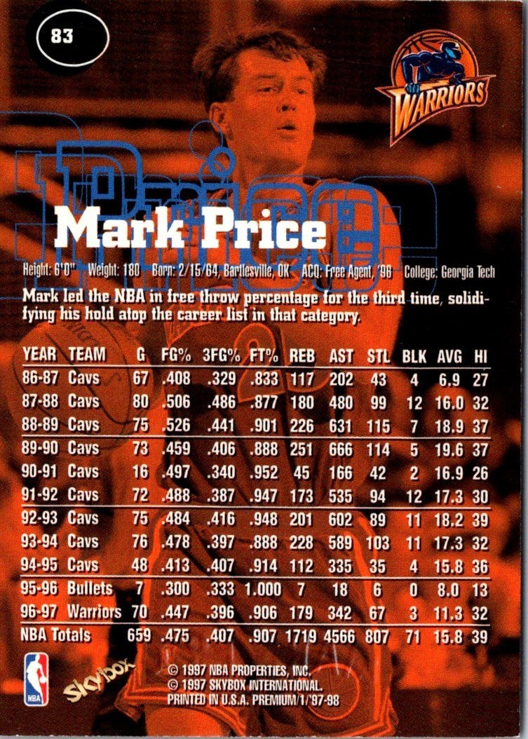 This 1997 SkyBox Premium Mark Price #83 Golden State Warriors card is a great addition to any collection. It features a vibrant and colorful design with a crisp, clean image of Price in action. The card is in excellent condition and will make an excellent display piece. A must-have for any Golden State Warriors fan or card collector. Add it to your collection today!