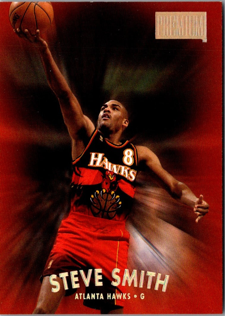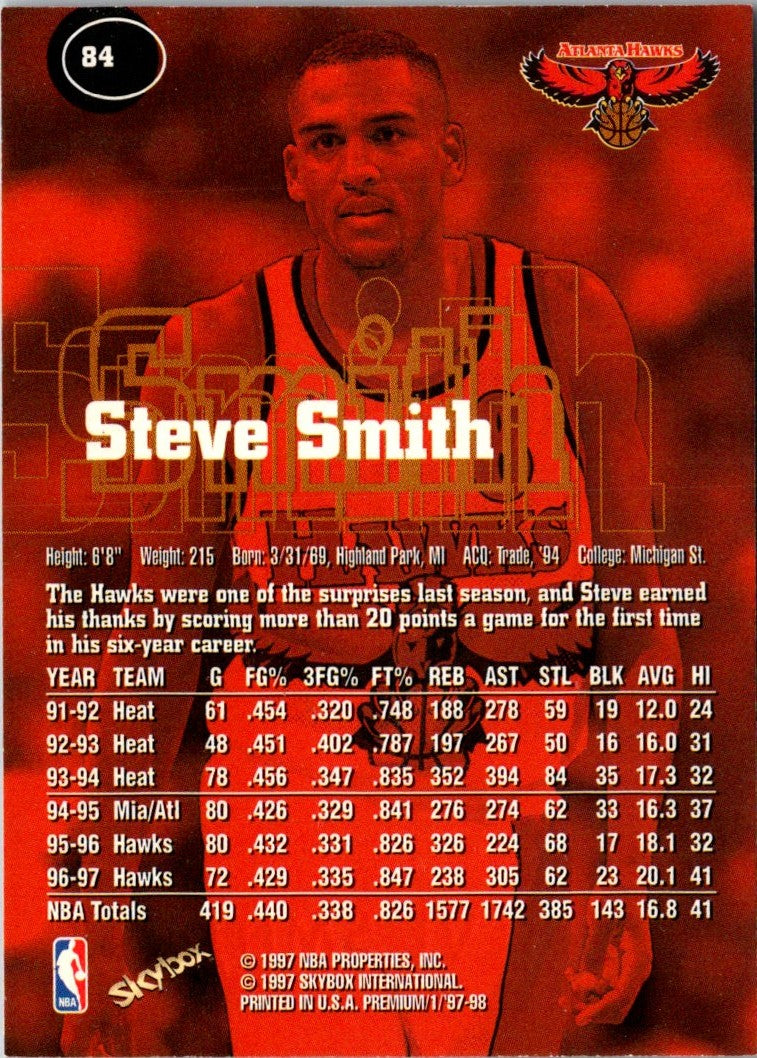 This 1997 SkyBox Premium Steve Smith card is sure to be a hit with any Atlanta Hawks fan. The card features Smith in his Hawks jersey, ready to make a play. Smith's stats are featured on the back of the card, making it a great way to remember the great player. With a classic design and a colorful background, this card is sure to be a great addition to any collection.