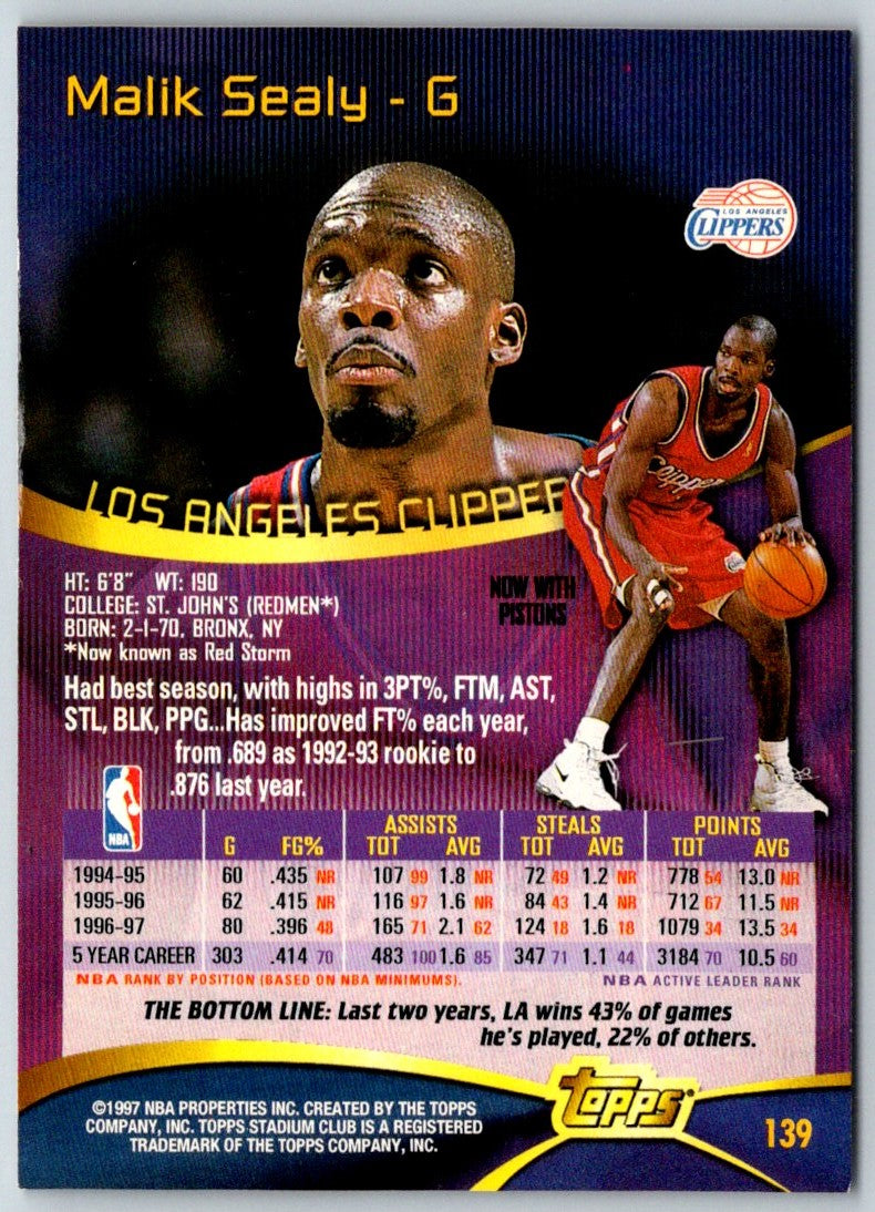This 1997 Stadium Club Malik Sealy card #139 is the perfect addition to any collection! This card features a color portrait of the Detroit Pistons player as well as an action shot on the back. It's a great way to remember and honor one of the greatest players of the Pistons. Get this card now to show your support and admiration for Malik Sealy!