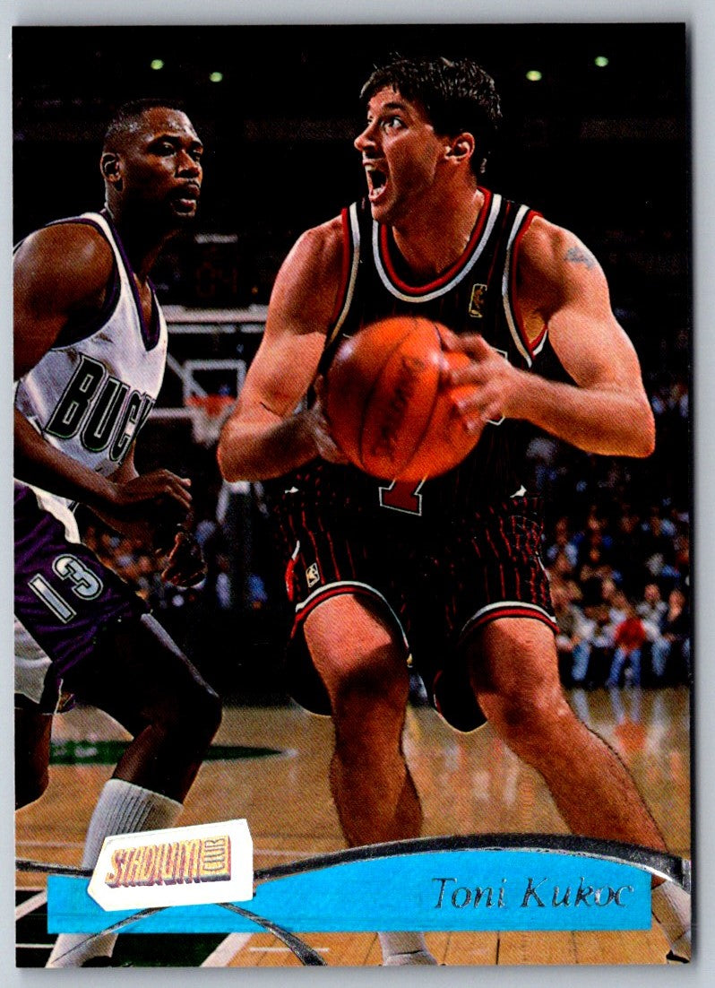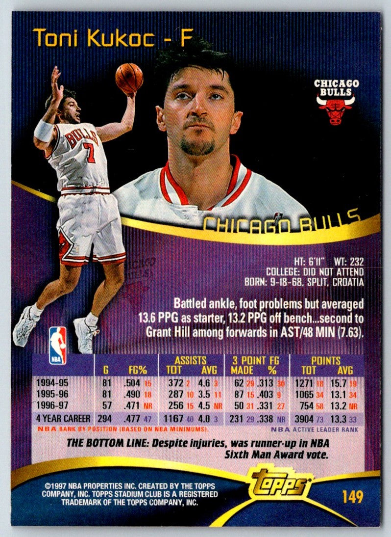 Relive the glory days of the Chicago Bulls dynasty with this 1997 Stadium Club Toni Kukoc #149 card! This card features a vivid image of the Bulls' star power forward, with his classic mid-range shooting form on full display. From his long locks of hair to his signature Nike kicks, this card captures Kukoc in full form. Add this card to your collection and commemorate one of the greatest dynasties in NBA history!