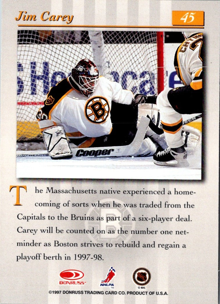 This 1997 Studio Jim Carey #45 Boston Bruins card is a must-have for any Boston Bruins fan! Featuring a classic portrait of the legendary player, this card is sure to stand out in any collection. The card is printed on high-quality cardstock with vibrant colors that will last for years to come. Perfect for any hockey enthusiast, this card is an ideal gift for any fan of the Boston Bruins. Celebrate the career of Jim Carey with this timeless piece of memorabilia!
