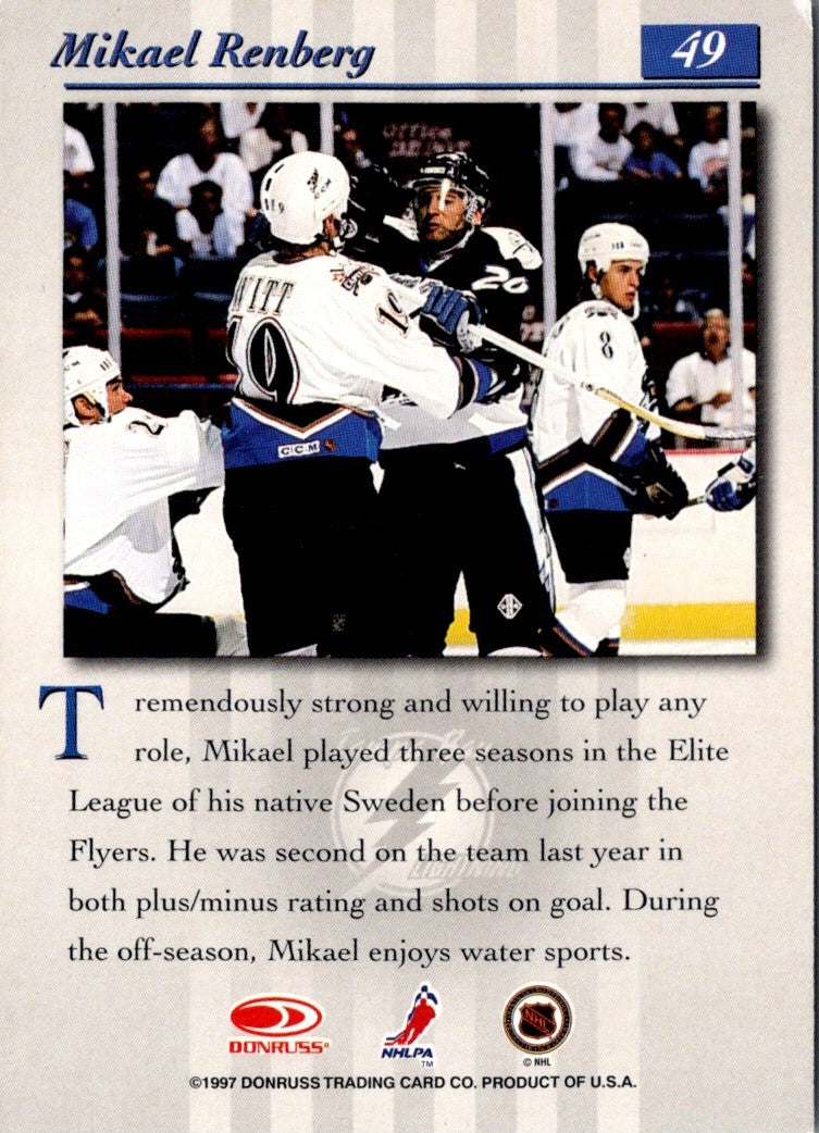 This 1997 Studio Mikael Renberg #49 Tampa Bay Lightning card is a must-have for any hockey fan's collection! Featuring a vibrant full-color image of Renberg in action, this card is sure to make any fan's collection stand out. With sharp corners and a glossy finish, the card is in excellent condition and ready to be displayed. Add this card to your collection and show your support for the Tampa Bay Lightning!