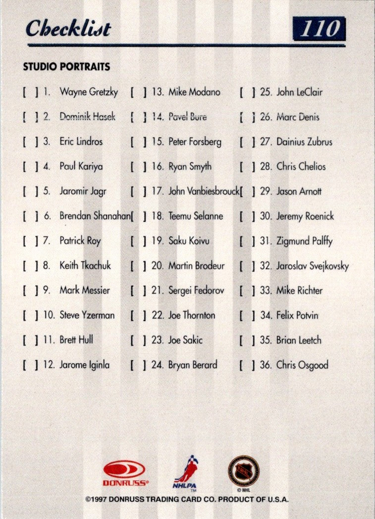 This 1997 Studio Patrick Roy #110 Colorado Avalanche hockey card is the perfect addition to any collection. Featuring a crisp image of Roy in his Avalanche uniform, this card is sure to be a hit with any hockey fan. The card is a standard size and has a glossy finish, perfect for displaying or trading. With excellent coloring and sharp corners, this card will look great in any collection!