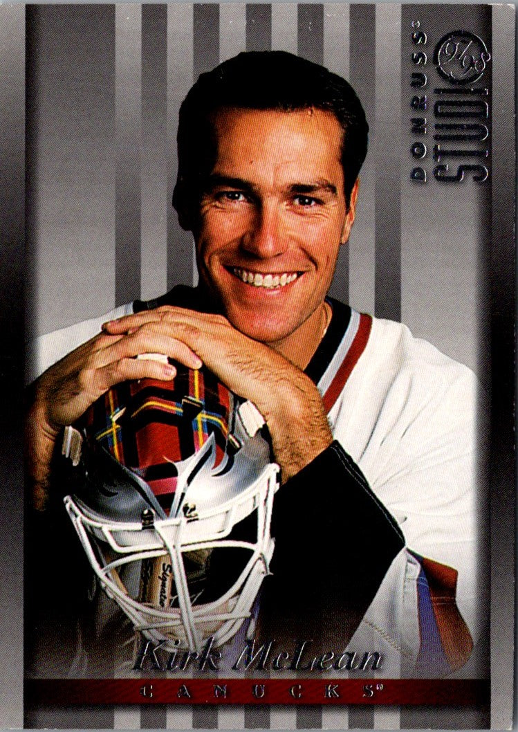 This 1997 Studio Press Proofs Silver Kirk McLean #88 Vancouver Canucks card is a must-have for any Canucks fan. This card features a full-color, glossy image of McLean in his Canucks jersey, ready to take the ice and make a save. The card is printed on high-quality cardstock, and the back of the card features a brief biography of the legendary goalie. This card is a perfect addition to any Canucks fan's collection, as it captures one of the greatest goalies in Canucks history.