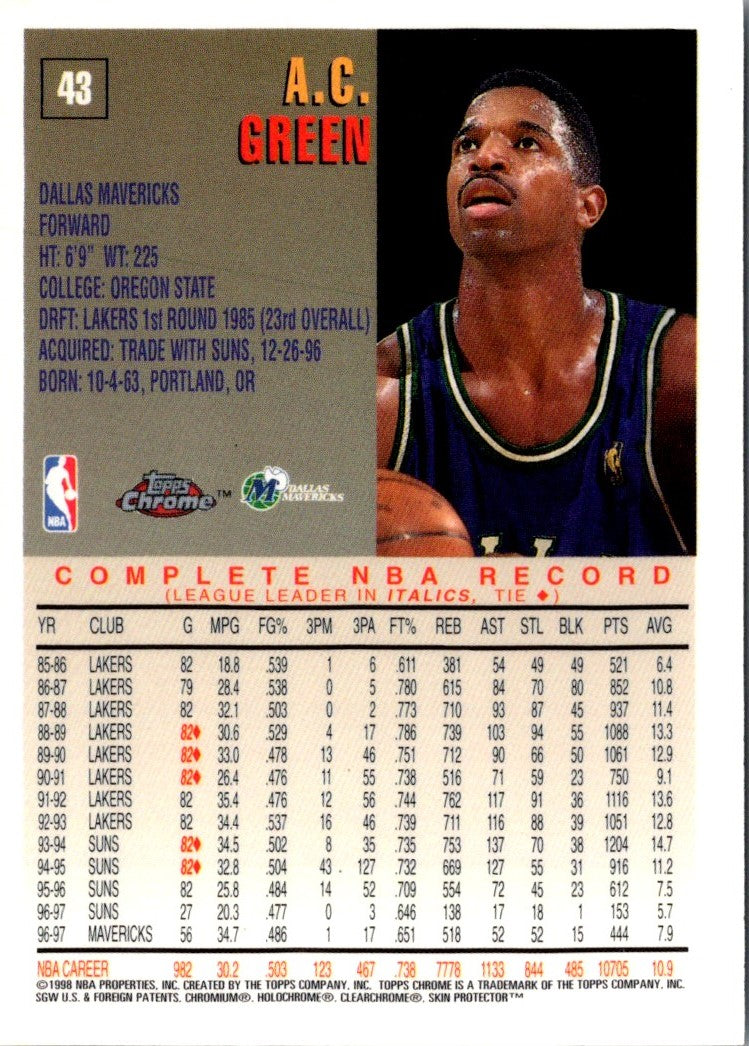 The 1997 Topps A.C. Green #43 Dallas Mavericks card is the perfect addition to any basketball fan's collection. Featuring a full-color, glossy image of A.C. Green in his Mavericks uniform, this card is sure to be a hit with collectors. The back of the card includes a comprehensive stat line, detailing Green's career accomplishments. This is the perfect way to commemorate the career of one of the most iconic figures in Mavericks history. Add this card to your collection today!