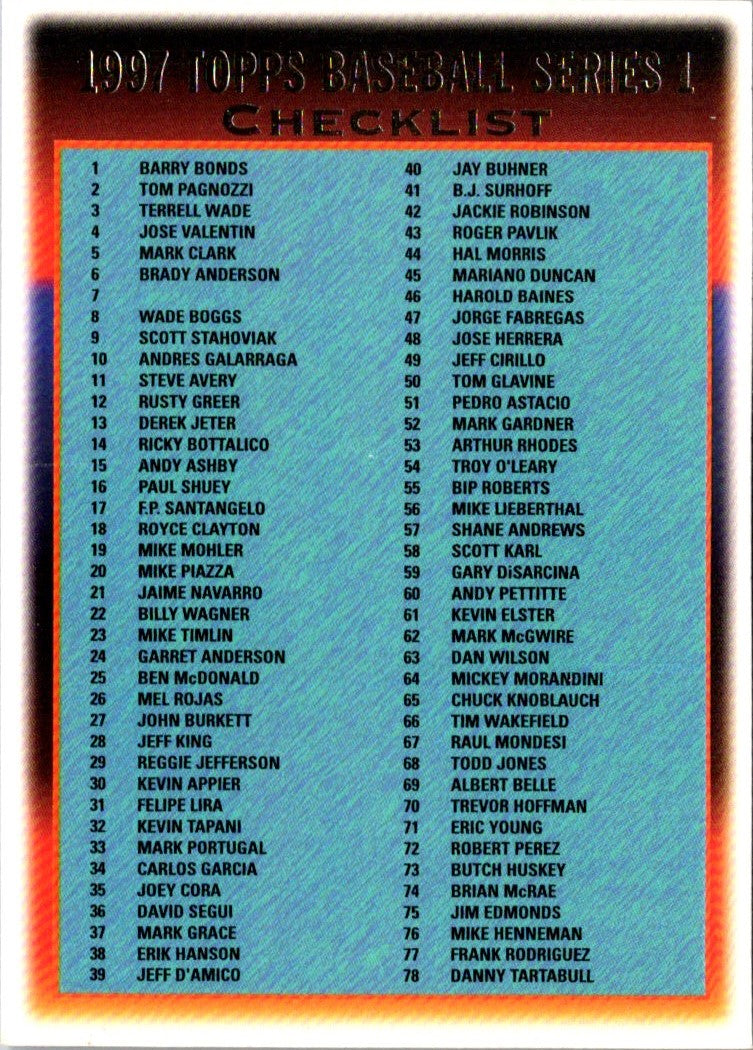 This 1997 Topps Checklist is the perfect way to kick-start your collection! Featuring cards #1-158, it's the perfect way to quickly pick up all the cards you need. It's an incredible value, and a great collection starter. All the cards feature the highest quality print and materials, so you know you're getting the best version of each card. Whether you're an established collector, or just starting out, this 1997 Topps Checklist is the perfect way to get the ball rolling. Don't miss out on this classic collection!