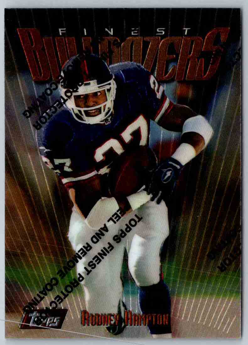 This 1997 Topps Finest Football Rodney Hampton #44 card features Hampton in his classic New York Giants uniform. His iconic image is printed on the highest quality card stock, with a glossy finish that adds a touch of sophistication and style. The card also shows off Hampton's impressive stats, including his 10,599 rushing yards and 78 touchdowns. This card is sure to be a must-have for any Giants fan or football card collector.