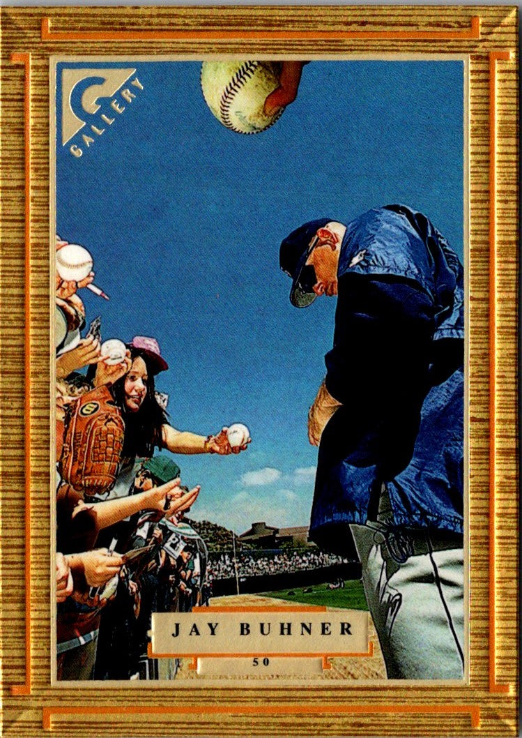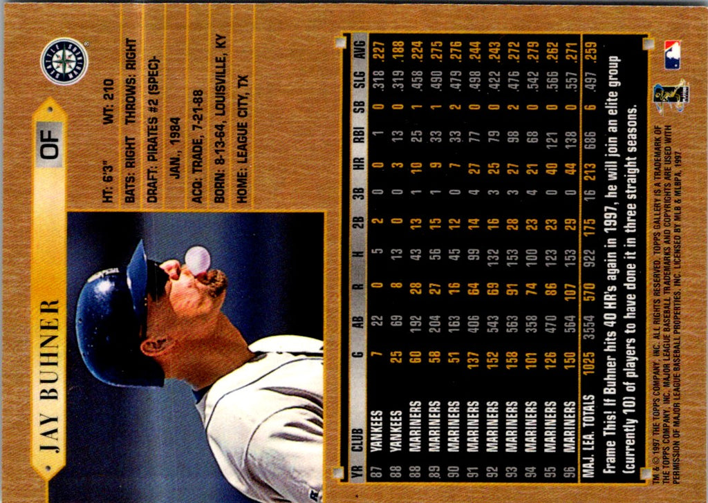 This 1997 Topps Gallery Jay Buhner #50 card is a must-have for any Seattle Mariners fan! The card features a full-color photo of Buhner, as well as his stats and bio on the back. It's a great way to commemorate the career of one of Seattle's most beloved players. Add this piece of Mariners history to your card collection today!