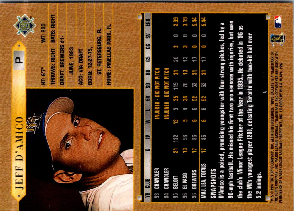 This 1997 Topps Gallery Jeff D'Amico #145 Milwaukee Brewers Baseball card is a must-have for any fan of the legendary pitcher. The card features a full-body portrait of D'Amico with a white Brewers jersey and a navy blue Brewers cap in front of a light blue backdrop. The card also has a gold foil stamp at the top that reads "Jeff D'Amico, Milwaukee Brewers". The back of the card reads "Jeff D'Amico was one of the most consistent pitchers on the Brewers roster during his four-year tenure. In 1997, he went 11-9 with a 4.11 ERA." This card is a great way to celebrate D'Amico's time as a Brewer and a great addition to any fan's collection.
