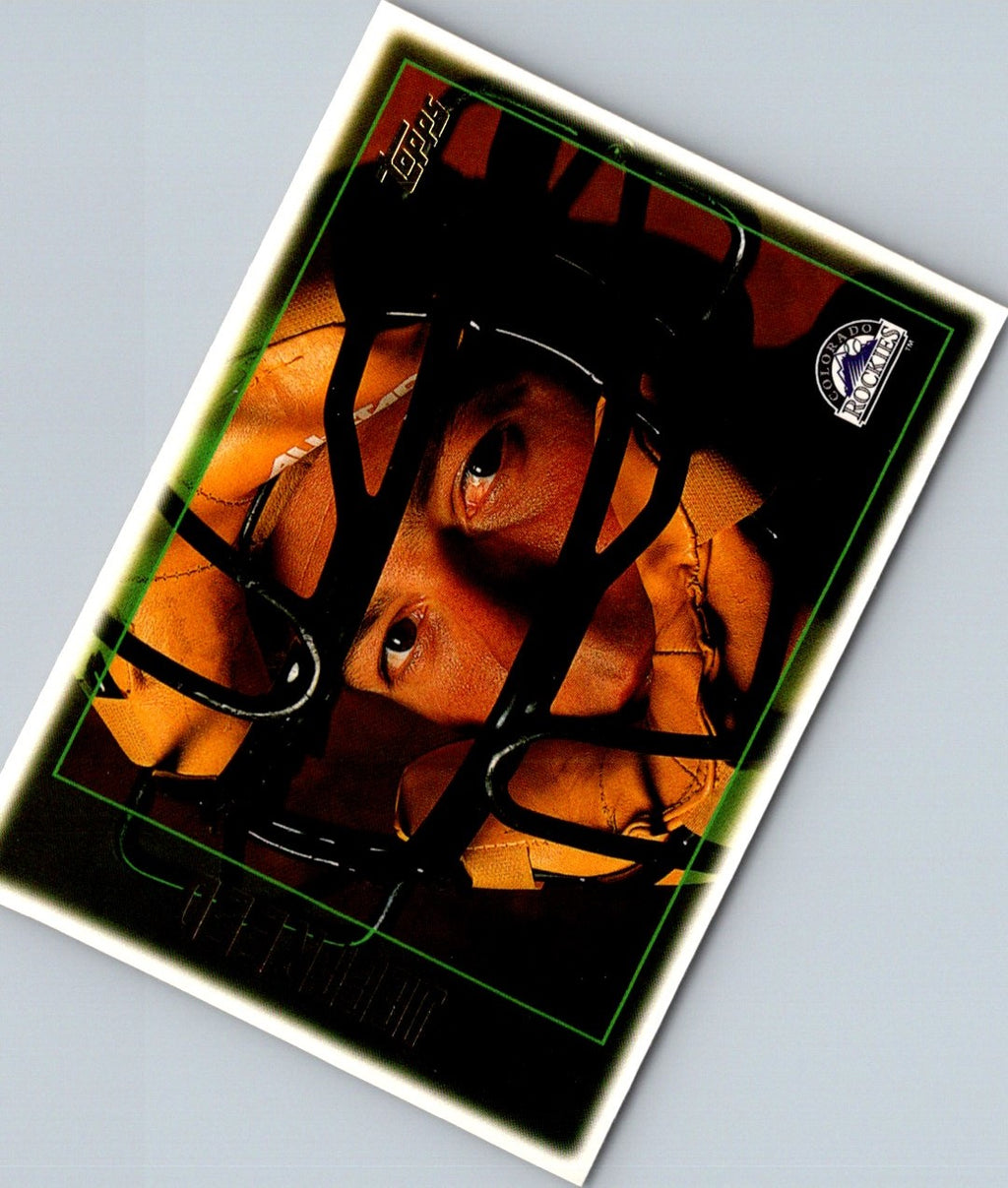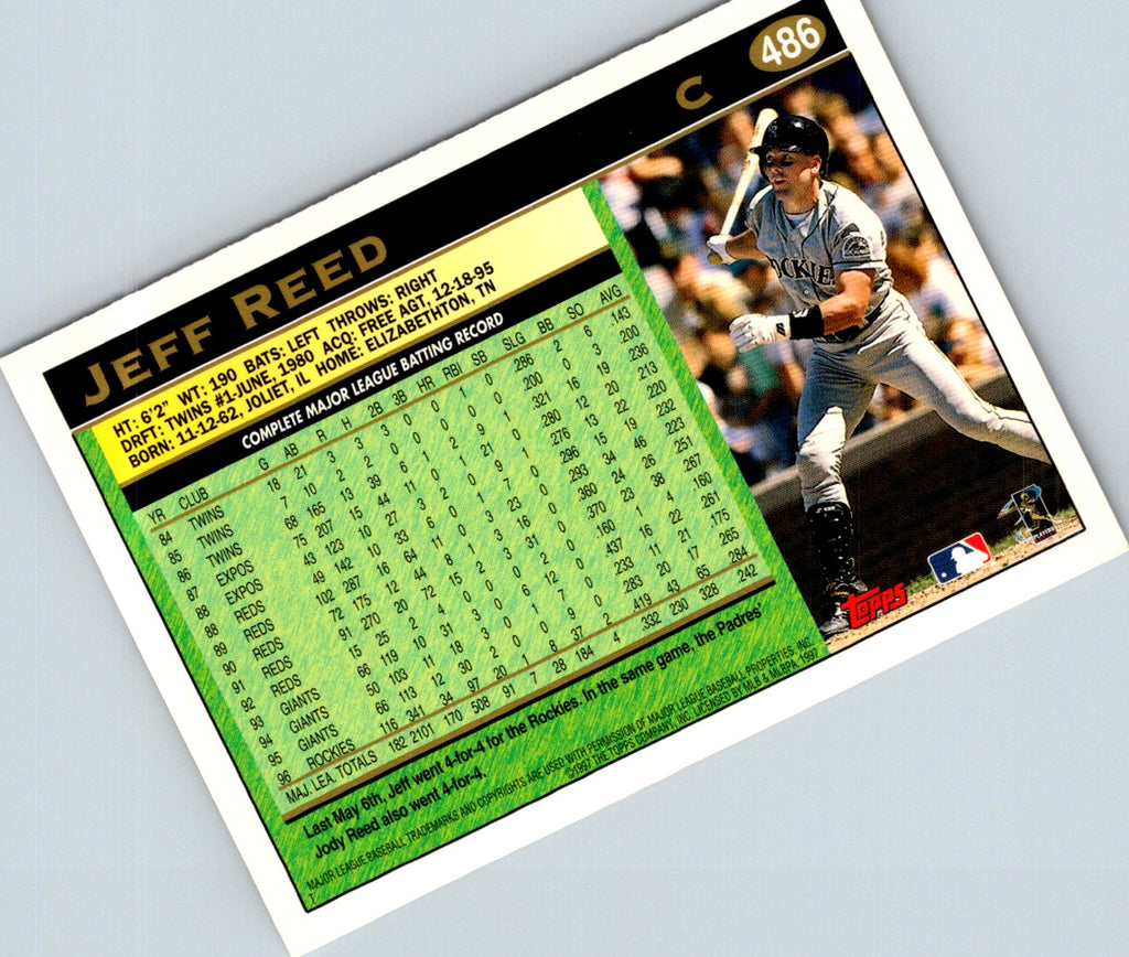 This 1997 Topps Jeff Reed #486 Colorado Rockies card features a full-color picture of Reed in his Rockies jersey. His stats are printed on the back, along with a short biography. This card is in great condition, perfect for any fan of the Rockies or Jeff Reed. Add it to your collection today!